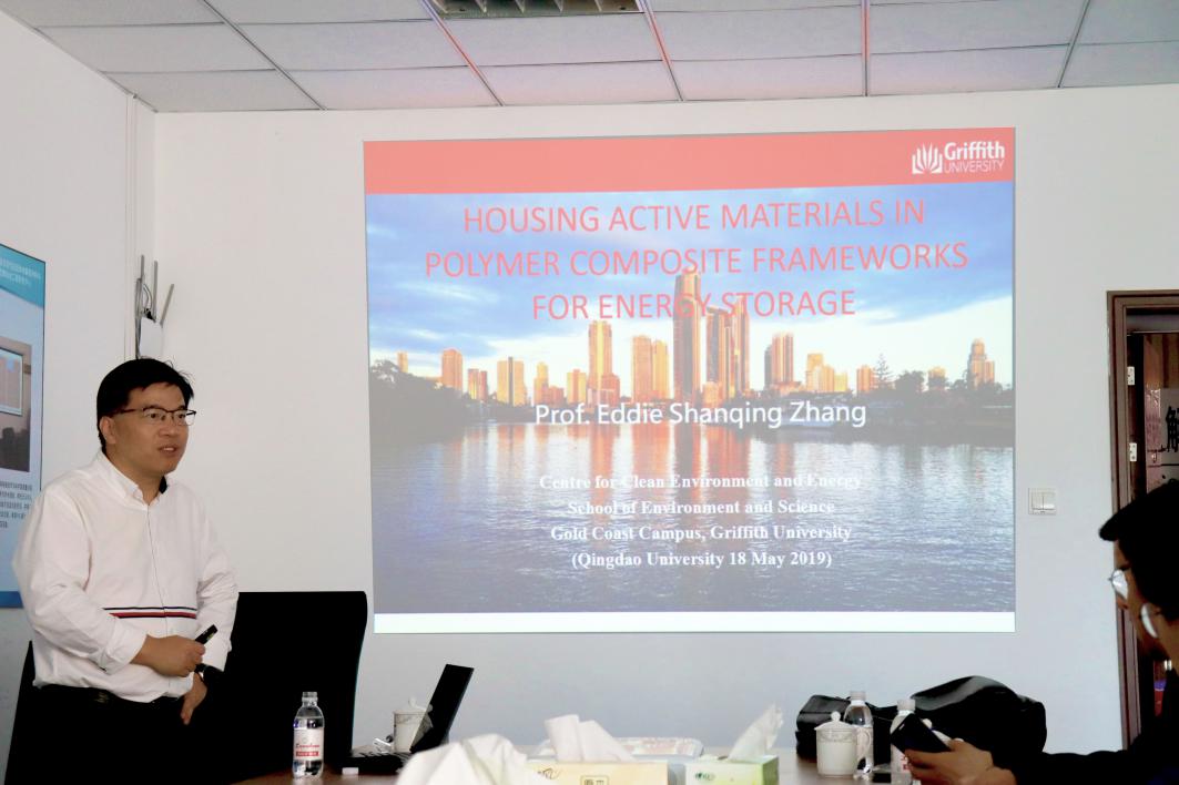 5月18日上午,澳大利亚格里菲斯大学清洁环境与能源中心张山青教授应我院青岛市高性能固体电解质材料与固态锂电池工程研究中心邀请,来我校进行交流访问,并在青岛大学科技园D座3楼报告厅为师生作了题为《Housing active materials in polymer composite frameworks for energy storage》的学术报告。报告会由青岛市高性能固体电解质材料与固态锂电池工程研究中心主任郭向欣教授主持。